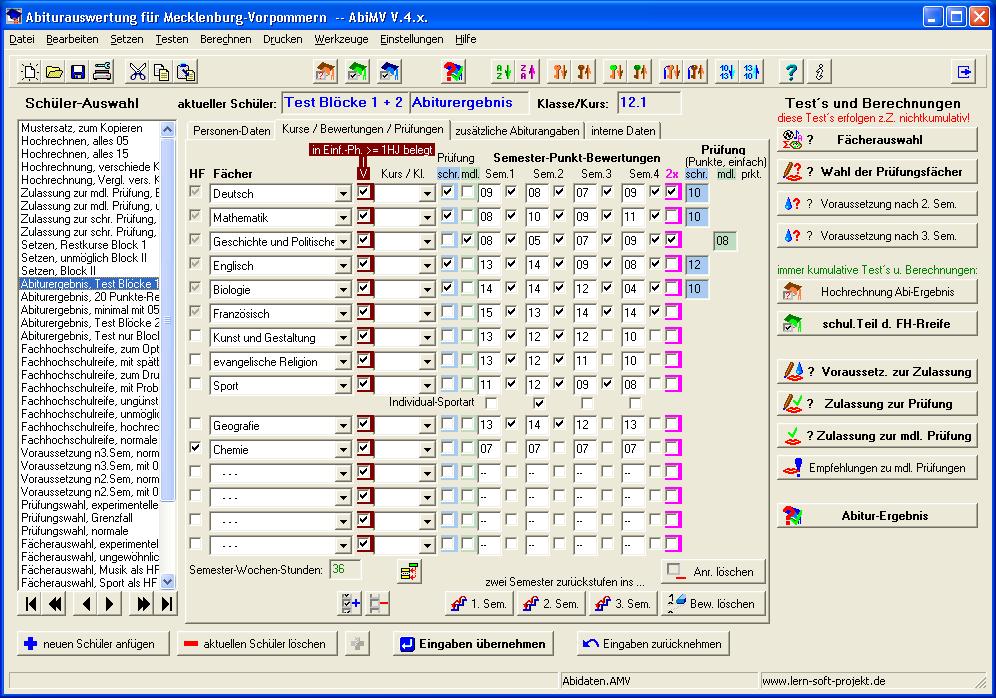 können nun die Daten für die aktuelle Abiturprüfungsverordnung für Mecklenburg-Vorpommern (AbiPrüfVO MV 4. Juli 2005) verarbeitet werden. (Prinzipiell sollte es aber auch für andere Bundesländer geeignet sein!)